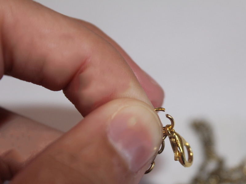 6: Add a jump ring to one of the ends of the chains and attach the lobster clasp.