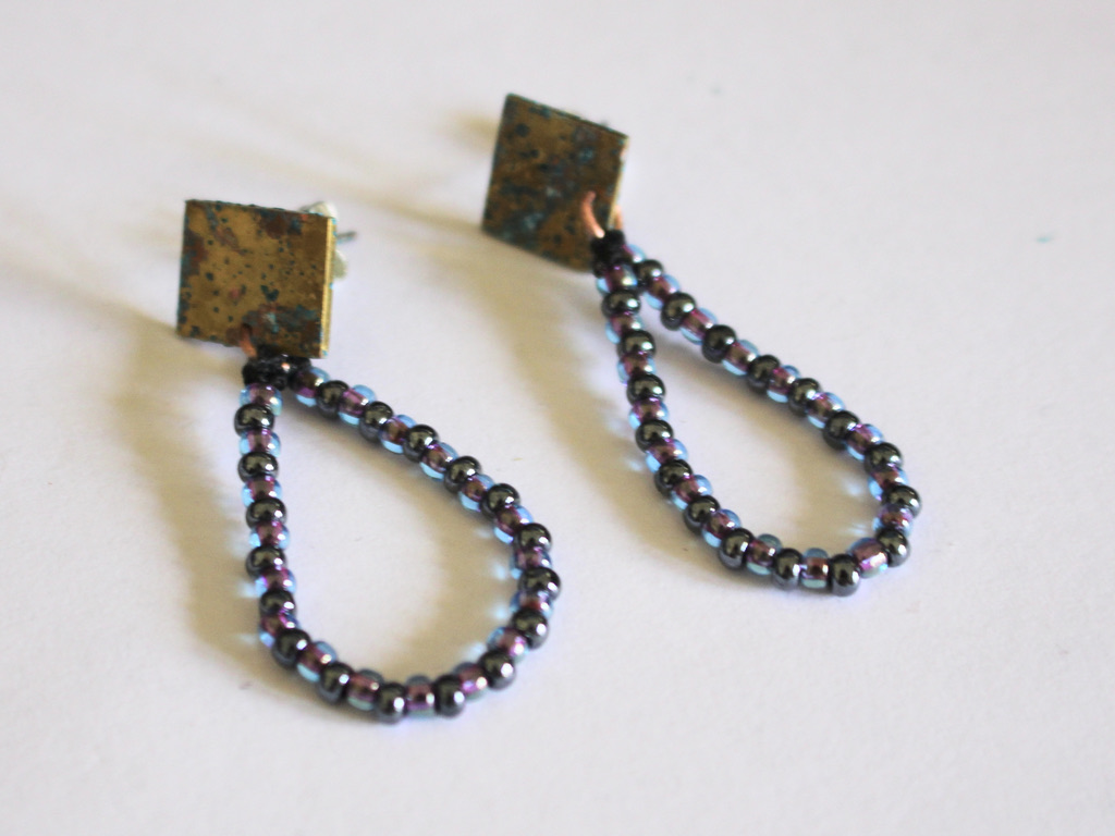 Here are some fun earrings you can construct at home! This is a great way to use the pieces of copper or brass that you created patina on using our salt and vinegar patina tutorials as well as some of your fave beads. Please note that this tutorial contains affiliate links.