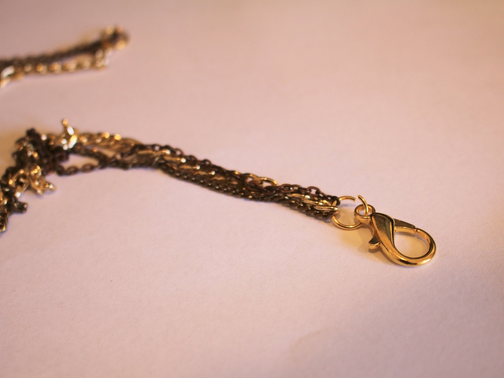 2: Two pieces of choker-length chain, one slightly longer than the other. You can check the length by wrapping your chain closely (but loosely) around your neck. I used an antique gold chain and a copper colored chain.