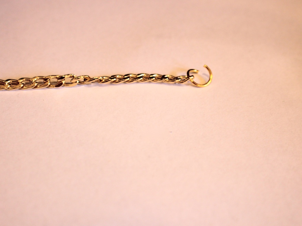 2: Attach one of the jump rings to one end of the chain. Do this by sliding the open jump ring through the end link of chain.